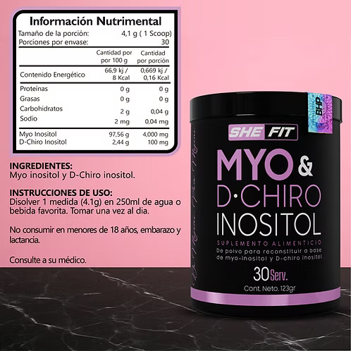 Myo & D-Chiro Inositol de She Fit es el suplemento favorito de las mujeres gracias a que cuenta con una increíble fórmula especialmente diseñada para equilibrar tu salud hormonal y potenciar tu bienestar femenino. Cada cápsula aporta una combinación óptima de: ● Myo-inositol (1 950 mg) y D-chiro inositol (50 mg) por porción (2 g), formulado en la proporción fisiológica ideal (40:1). Esta alta concentración respeta el equilibrio natural del cuerpo, maximizando su efectividad y posicionándolo como una opción superior para apoyar tu bienestar femenino. ● Concentración Superior vs Otras Marcas : más del doble de inositoles comparado con otras marcas, entregando a tu organismo mejores resultados. [Myo & D-Chiro Inositol de She Fit 2000 mg vs. 705 mg Otras marcas].